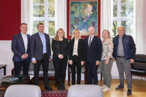 Fv: Jógvan Emil Nielsen, skrivari, Tróndur Sigurðsson, limur í bygginevndini, Guðrið Højgaard, nevndarlimur og næstforkvinna, Annika Olsen, nevndarlimur, Heðin Mortensen, formaður í nevndini, Elin Heðinsdóttir Joensen, nevndarlimur, og Tummas Justinussen, limur í bygginevndini. Á myndini vanta Niels Mortensen úr bygginevndini, og Bergur Poulsen, nevndarlimur.