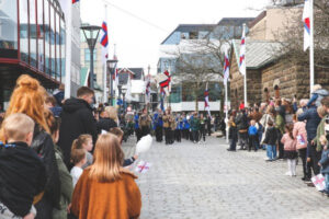 Skrúðgongan byrjar kl. 15, tá skótarnir í Havn marsjera saman við hornorkestrinum. Gingið verður úr Tróndargøtu við Finsen og síðan eftir Niels Finsens gøtu oman til Ráðhúsið.