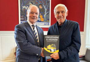 Í dag vitjaði Poul Michelsen inni á sínum gamla arbeiðsplássi, har hann handaði sitandi borgarstjóra, Heðini Mortensen, eitt eintak av bókini. Heðin helt høvuðstaluna á veitsluni hjá fyritøkuni leygardagin, har hann skemtiliga greiddi frá samskiftinum teirra millum líka frá barnsbeini av.