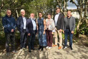 Á myndini frá vinstru: Hákun Djurhuus Jacobsen, orkufrøðingur hjá Landsverki, Sigurð Ó. Vang, deildarleiðari á Verkætlanardeildini á Landsverki, Hans Christian Dam, stjóri í Fjarhitafelagnum, Súsanna Bertholdsen, landsstýriskvinna í heilsumálum, Annita á Fríðriksmørk, forkvinna í Fjarhitafelagnum, Steinar Eirikstoft, forstjóri í Sjúkrahúsverkinum og Jóan Símun Saltá, depilsleiðari á Tænastudeplinum á Landssjúkrahúsinum.