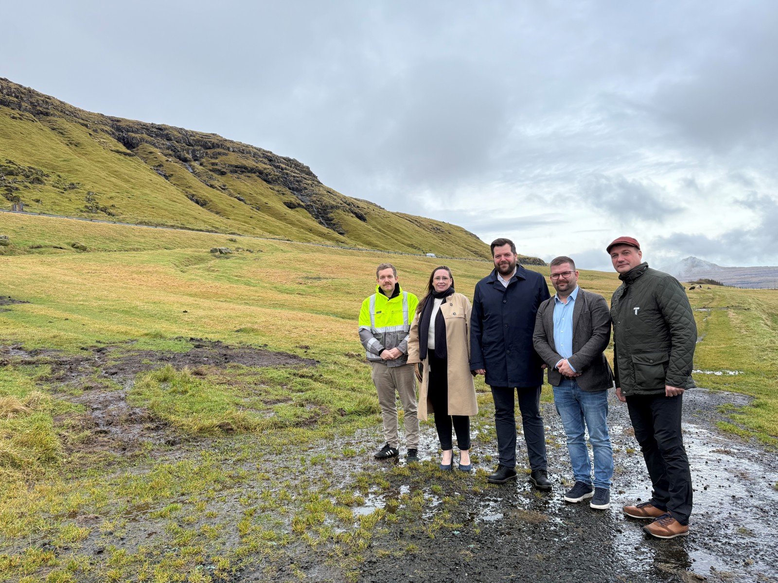 Á myndini frá vinstru: Bjarni Seyer Heinesen, byggifrøðingur á Landsverki, Marjun Thomassen, stjóri á Landsverki, Eirikur í Jákupsstovu, landsstýrismaður í almanna- og mentamálum, Hans Anders Jacobsen, borgarstjóri í Sjóvar kommunu og Herleif Hammer, stjóri á Tjóðsavninum, sum vóru innan Glyvur og hugdu at grundøkinum, har varðveitingarmiðstøðin hjá Tjóðsavninum verður bygd.