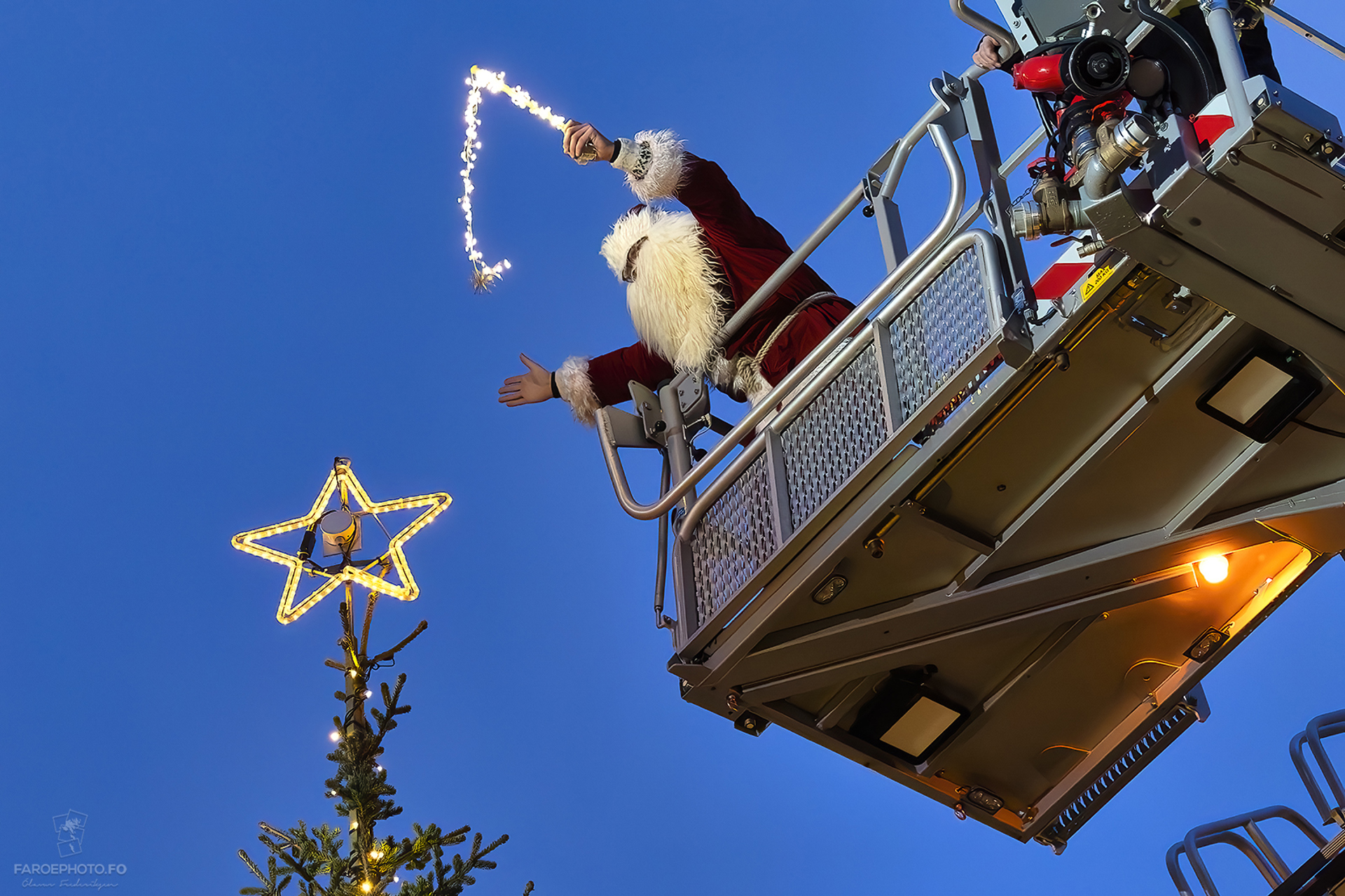 Julius og Rógvi koma at hjálpa børnunum at tendra ljósini, og teir koma sjálvandi á Vaglið í einum gomlum, reyðum sløkkiliðsbili.