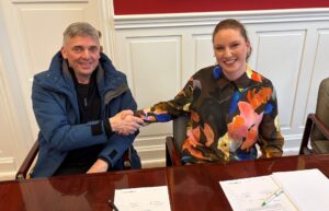 Sáttmáli um heildararbeiðstøku varð í dag undirskrivaður millum Elsu Berg, borgarstjóra, og Valbjørn Dalsgarð, um bygging av trivnaðarhúsinum.