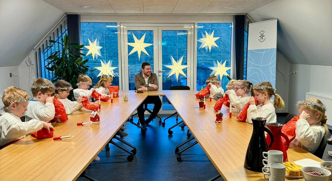 Í morgun høvdu vit sera fitta vitjan av børnum á dagstovninum við Kráir, ið gingu lucia á kommunuskrivstovuni. Aftaná lucia gongdina og jólasang fingu børnini pakka frá borgarstjóranum og eina frágreiðing um hvat kommunan ger. Hetta skrivar Sunda kommuna 12 desember.