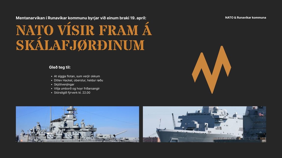 Hesaferð byrjar vikan við ein braki av einum tiltaki sunnudagin 19. apríl, tá Nato fer at vísa partar av flotanum fram. Fyriskipararnir siga, at vitjandi kunnu gleða seg til: